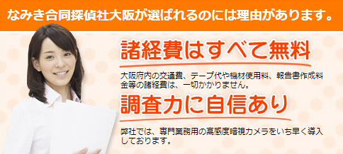 なみき大阪では、コスト削減のため、高額な宣伝費用のかかるテレビCMなどの広告宣伝は行っていません。 調査費用に影響が及ぼすような事務所の運営費を出来る限り低くし、浮気調査を依頼された方が安心して調査をご依頼いただけるよう、料金は必要最低限に抑えています。